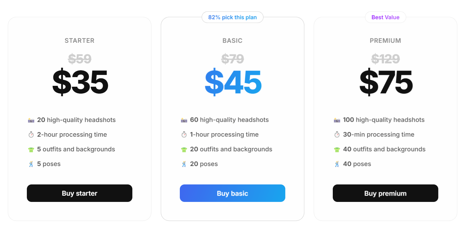 | Starter | 20 high-quality headshots, 2-hour processing | $35 |