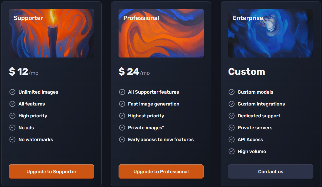 | Supporter | $6/month | Faster generation, unlimited images, no ads |